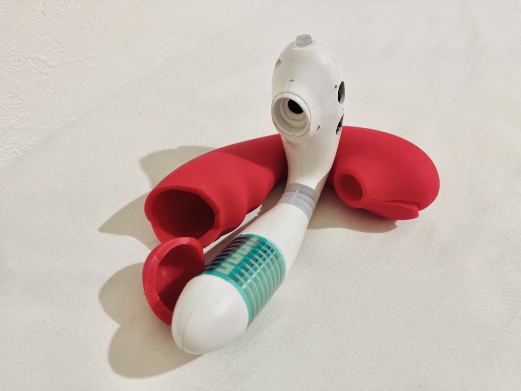 Taraの別名は「吸うやつ」。クリトリスを吸引するローターと、Gエリアを震わせるバイブが1つになっております。お察しのとおり、タコのおくちのような窪みをクリトリスにあてがい、3つの山嶺をいだく棒部分を中へ挿入します。